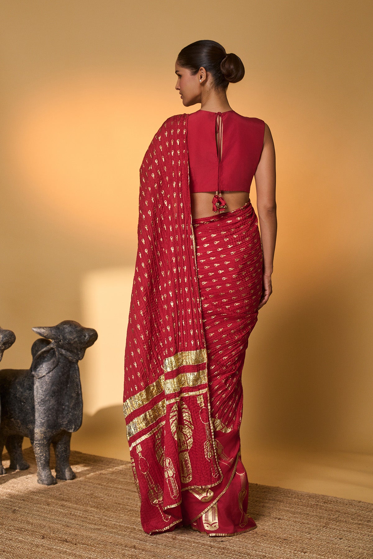 Details: Saree – An elegant half-and-half saree featuring foil print | pleats adorned with tribal mask and pillar foil prints | pallu crafted in crushed fabric with an all-over tribal mask foil print | further enhanced with beautiful gota detailing. Blouse – Red habutai silk blouse piece