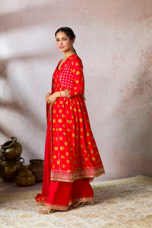 Details: Kurta- Digital print A- line kurta with a beautiful Palmscape print yoke | Embellished with embroidered borders | 'V' Neckline | Side seam closure Pant- Red straight pants embellished with embroidered border at the hem | Side seam closure Dupatta- Organza dupatta | Adorned with red trinkets print and embroidered border | Edged with kinari