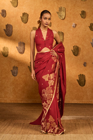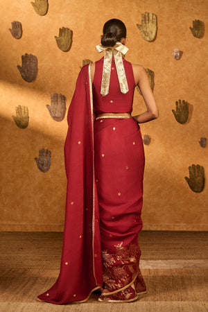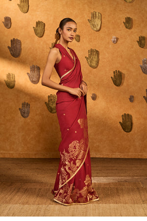 Details: Saree- A saree woven with rich jacquard zari, enriched with continuous patterns that elevate its luxurious appeal. Blouse Piece- The blouse piece is crafted in jacquard fabric, beautifully adorned with intricate zari motifs.