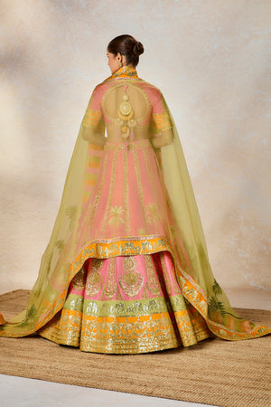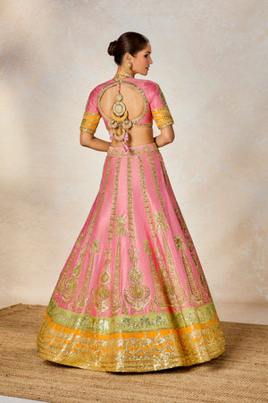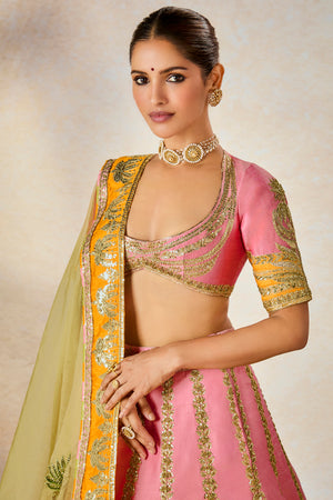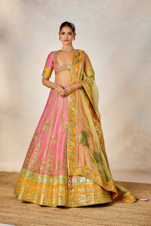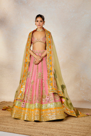 Description: The Rose Thandai lehenga is a dusty pink heavily embellished lehenga set on a silk background with motifs inspired by 'Chand-phool', 'Sehra','Amaltas' realized through sitara and moti embroidery. Finished with a contrast ochre border that adds some whimsy, this is for the bride who prefers subtle glamour whilst remaining true to her traditional roots.
