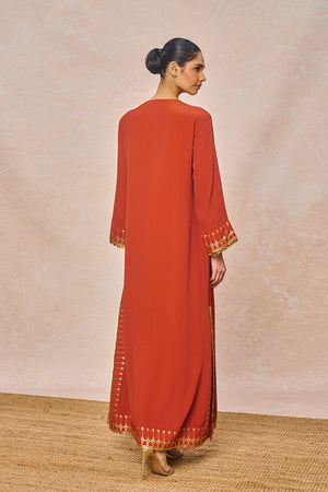 Details: A timeless rust kaftan, featuring intricate hand embroidery at the front. Side slits are accented with a foil border and delicate coin detailing, adding subtle shimmer and artisanal charm to the silhouette.