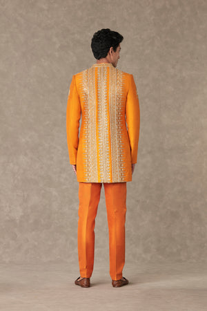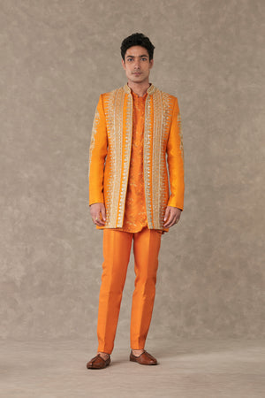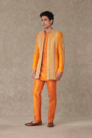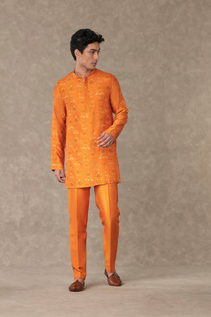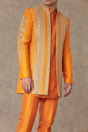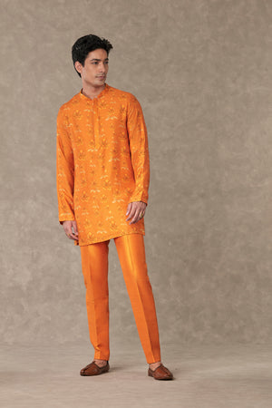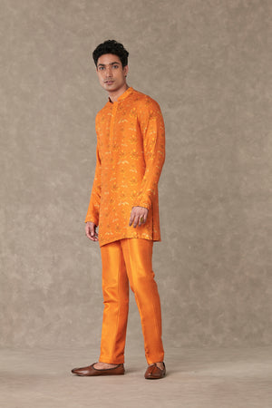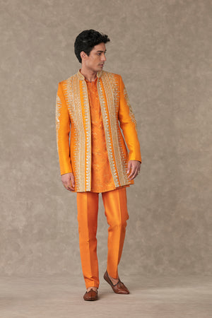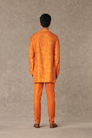 Styling: Style the classic raja koti with our Orange Kurta Set Men ankle pants and mojris