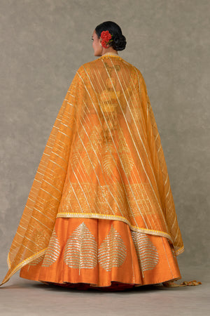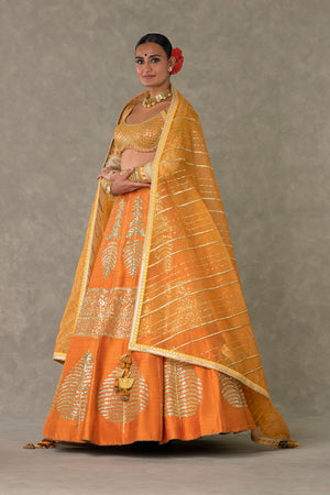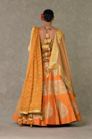 Details: Lehenga- Lehenga embellished with Paan-Patti & Son-Chidiya motif in dori & sitara kaam | Hemline Edged with Kinari | Kali with kinari insertion across the lehenga | Pocket detail |Comes with a separate can skirt Blouse- Scoop neck blouse adorned with Jhaali in Dori and sitara kaam| Patchwork sleeves with a mix of digital print and embroidered contrast borders edged with kinari and zip closure | Center back closure with tie-up tassel detail | Printed lining Dupatta- Organza dupatta with gota with kianri silai running across | Embellished with embroidered borders and edged with kinari | Tassel detail Dupatta- This Rust orange bridal lehenga. Comes with All over digital printed dupatta embellished with embroidered border and edged with Kinari | Tassel detail