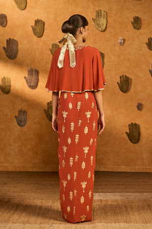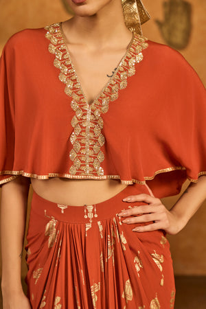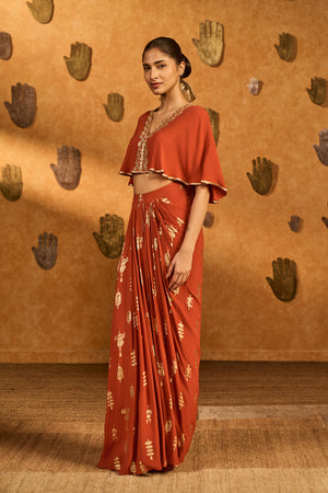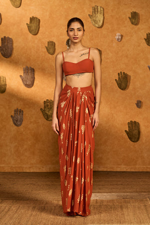 Details: Shrug- Rust cropped shrug with center front opening | V- neckline adorned with gold embroidery Skirt- All over printed drape skirt | Side seam closure Bustier- Bustier with center back opening