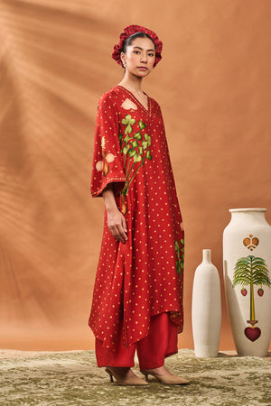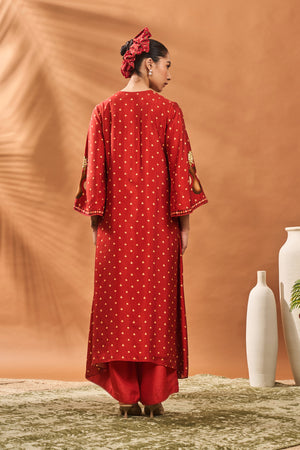 Details: Rust spade blossom kaftan adorned with crochet detailing | 'V' neckline | Bell sleeves Bottom- Bottom embellished with crochet border at the hem | Side seam closure