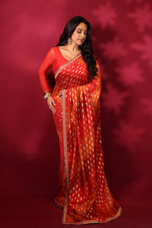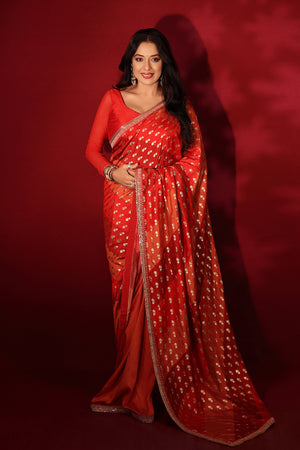 Details: Saree- Beautiful rust saree with foil printed stripe palla | Embellished with embroidered borders.