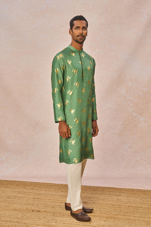 Details: Kurta- All over foil printed kurta | Full sleeves | Mandarin collar | Pocket detail | Concealed placket Pant- Straight pants with pocket
