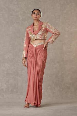 Details: Salmon Cropped Blazer Set - Son-Chidiya Cropped blazer embroidered with moti, dori & sitara kaam |Full sleeve | Notch collar | Centre front closure Drape Skirt - Drape skirt with 'V' shaped waist belt| Waist belt embroidered with dori & sitara kaam| Centre back closure Tube - Salmon fitted tube with Center back closure | Comes with detachable strap
