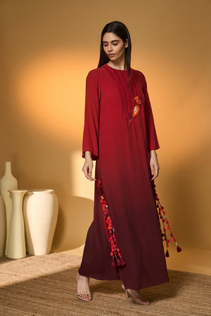 Details: Kaftan-Straight kaftan | High slit Adorned with tassels | Digital print ombre red with a placement of a flock on yoke | along with embroidered yoke