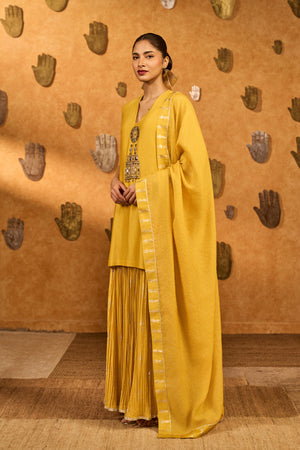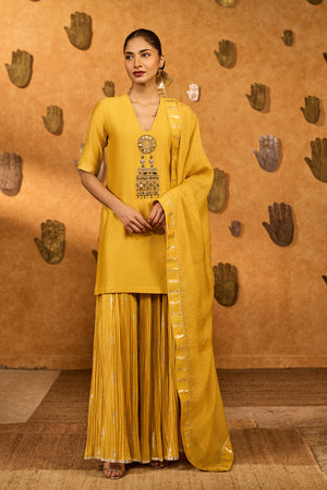Details: This ochre 3-piece set exudes festive charm with its vibrant hue and thoughtful detailing. The A-line kurta features a striking central embroidered panel in gold and silver, adding a touch of regal elegance. It is paired with flared mul silk pants adorned with delicate gold foil print, offering graceful movement and subtle shimmer. The look is completed with a lightweight chanderi dupatta, also embellished with gold foil motifs and finished with a gleaming gota border, blending tradition and modernity in perfect harmony.