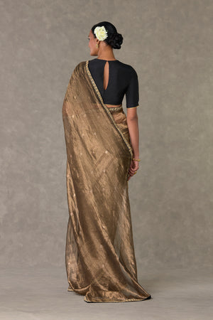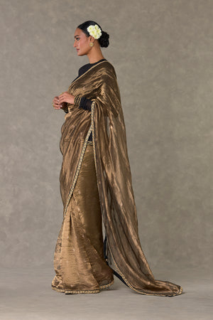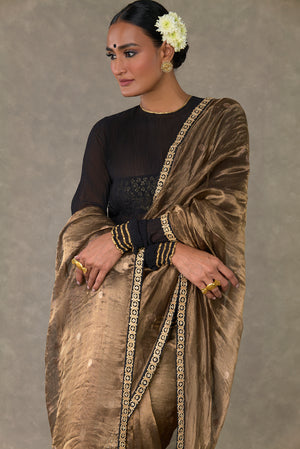 Details: Saree - Black Surma Tissue Saree with zari boondi all over| Embellished with embroidered border Blouse piece - Blouse piece embellished with 'Paan-Patti' in dori and sitara kaam Tube - All over jhaal in dori sitara and dabka kaam |Detachable straps |Centre back closure Kurta - Sheer crushed kurta with gota silai along the hemline| Zero neckline with centre back closure | Churi sleeves