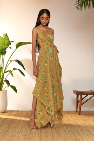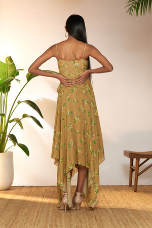 Details: Tan Lemon Frenzy Handkerchief Dress - Wrap detail | Adjustable strap | Handkerchief hem