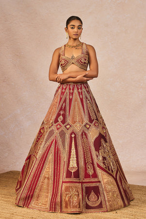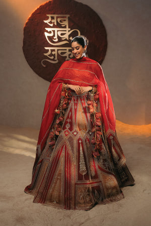 Description: This vibrant 'Tenu Takdi Ravah' Lehenga features a rich interplay of different shades of red,and intricately embroidered 'Mithi Makaai', 'Paankh Bagh', 'Gul Jharokha' and "Kashmiri Kali' motifs, crafted from tissue fabric that add depth and texture to the silhouette. Paired with a complementary blouse, the ensemble strikes a perfect balance of traditional richness and modern elegance. The dupatta enhances the look with a patchwork of red-toned organza and tissue panels, each box detailed with intricate gold embroidery, adding a complete finish that beautifully ties the entire outfit together for festive and celebratory occasions.