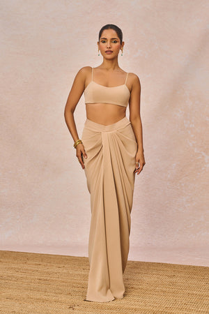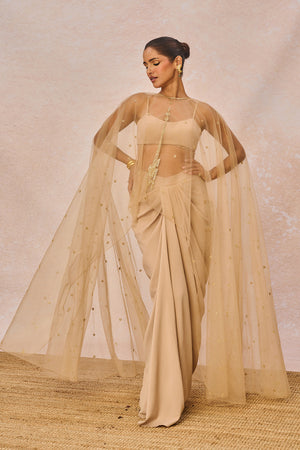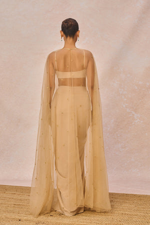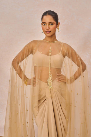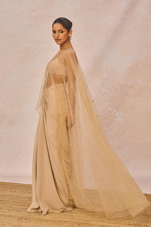 Description: ‘TERA KHAYAL’ fusion set is an elegant three-piece set features a delicate tulle cape, intricately embellished with embroidery inspired by our Meethi Makkai motif and scattered bootis, finished with a subtle back closure. It is paired with a front-pleated draped skirt that offers graceful movement, enhanced by a printed facing and a clean back opening. Completing the look is a solid V-neck blouse with a printed lining, balancing simplicity with quiet detail. A refined ensemble that blends texture, print, and craft effortlessly.