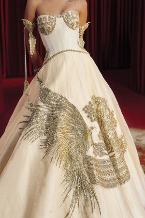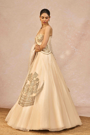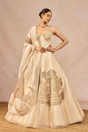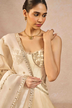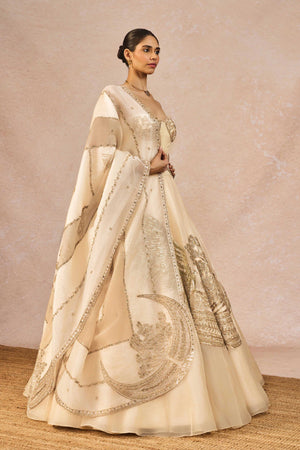 Description: This 'Tera Khayal' Lehenga is a blend of elegance and symbolism, featuring gold tissue patch with intricately embroidered which has the signature 'Son Chidiya' motif delicately perched atop a 'Chaand' motif, creating a striking visual narrative. Styled with a structured ivory corset adorned with finely embroidered 'Chaand Phool' motifs on both corners, the ensemble exudes modern grace rooted in tradition. It is completed with a trio of ivory-toned organza dupattas, each subtly embellished with'Son Chidiya' motifs, adding layers of lightness and meaning to this ethereal and thoughtfully designed look.