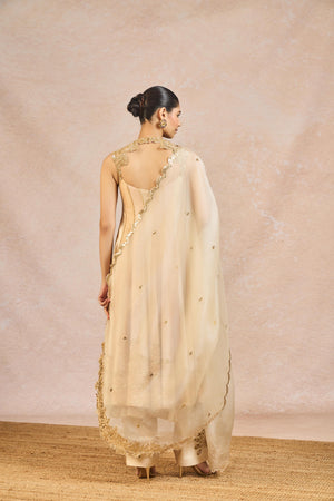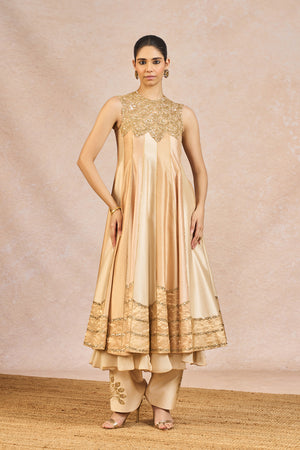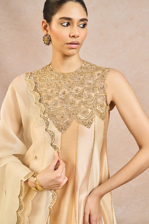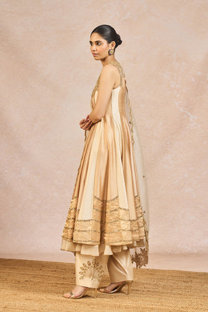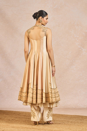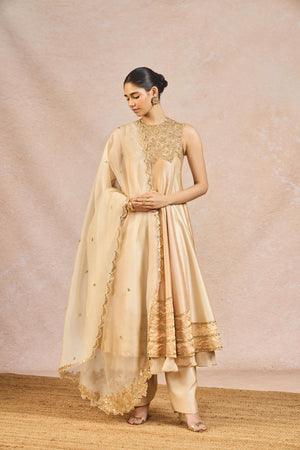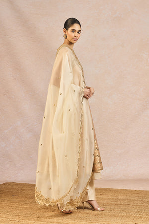Description: Delicately crafted in shades of ivory and beige, this Anarkali set embodies timeless elegance. The highlight of the ensemble is its intricately hand-embroidered yoke, framed with graceful scallops that draw the eye with their refined detailing. The flared Anarkali flows into soft panels, creating a silhouette that’s both fluid and regal. Paired with ivory salwar pants in Taaru motif, the look is completed with a sheer organza dupatta finished in a unique crescent-shaped hem. Subtly bordered and ethereal in its fall, the dupatta enhances the ensemble’s overall grace. Ideal for special occasions, this look celebrates understated opulence through every meticulously crafted element.