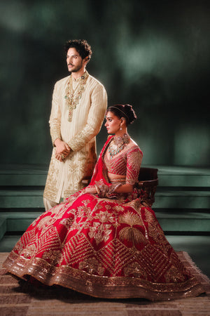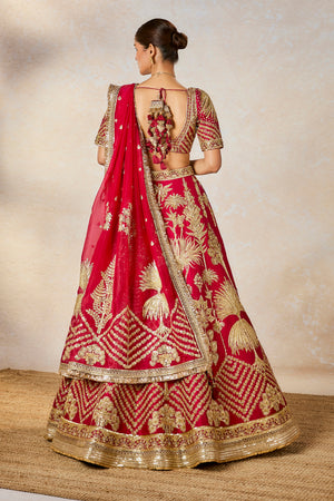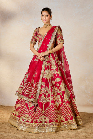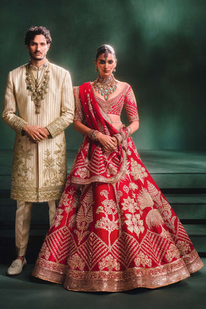 Description:Adorned in the age old craft of hand embroidery done over several hours by skilled artisans, The Aalu Bukhara lehenga embodies the free spirited bride. House motifs like the Jharna, Son Parni and Amaltas are brought to life in Dabka, moti and dori kaam. Paired with an ornate blouse that brings together the whole look with the help of a dupatta and heavily embroidered veil. Comes with a separate cancan.