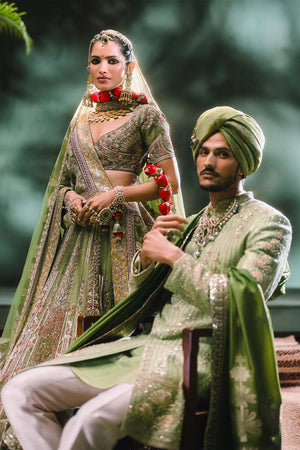 Description:The Aam Panna Lehenga- like its name is bursting in flavour and vivacity, this lehenga is embelished in sequins work and Naga tiki work thats further highlighted in delicate pink sequins, this lehenga brings to life the tropical richness of indian wilderness. With mismatched borders skirting the hem, and an intricately embroidered choli- this lehenga is for the carefree bride who isn't afraid of self expression. Comes with a separate cancan.