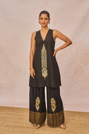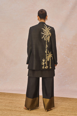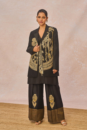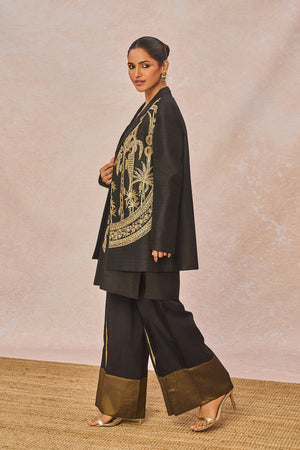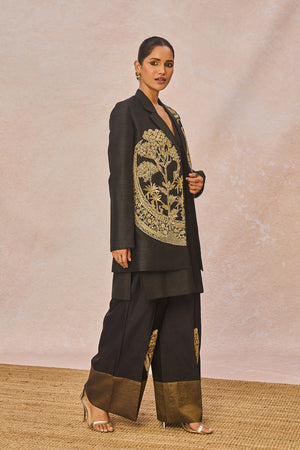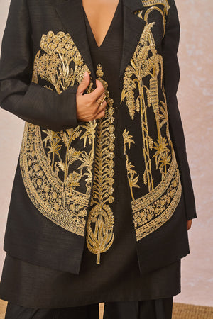 Description: This three-piece fusion set is crafted in rich raw silk, blending Indian craftsmanship with contemporary tailoring. The statement blazer, made in heavy raw silk, features Gul Chand motif placement embroidery in gold dori and sequins, . Layered underneath is a black raw silk kurta embroidered with Kashmiri Kali motif, paired with straight pants that mirror the blazer’s artistry. Together, this ensemble merges formal structure with regal embellishment, ideal for festive occasions and high-impact events.