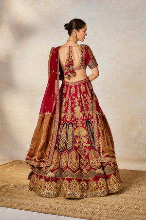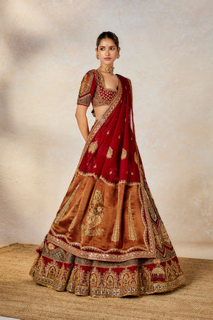 Fabric: Lehenga- Heavy Raw Silk, Silk Velvet & Georgette Tissue | Blouse- Heavy Raw Silk, Silk Velvet & Georgette Tissue | Dupatta 1 - Georgette Tissue | Dupatta 2- Silk Organza & Georgette Tissue | Veil- Tulle