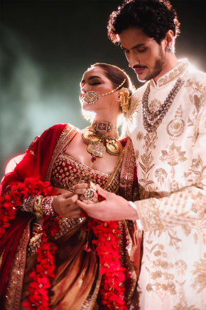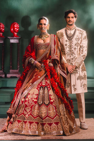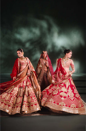 Description:Resplendence takes a rare form in this ornate ensemble. The Anar Bagh lehenga is a velvet patchwork lehenga adorned with our Anant Bel and Anasam Rekha motifs, which has tissue inlays running across the the bottom of the lehenga. Our Baug Taj motifs are intricately embroidered on the tissue and finished with a jaal tissue patchwork. It's heavily embelished veil where our Nirjarapushp motif sways in the emotion of a bride. Comes with a separate cancan.