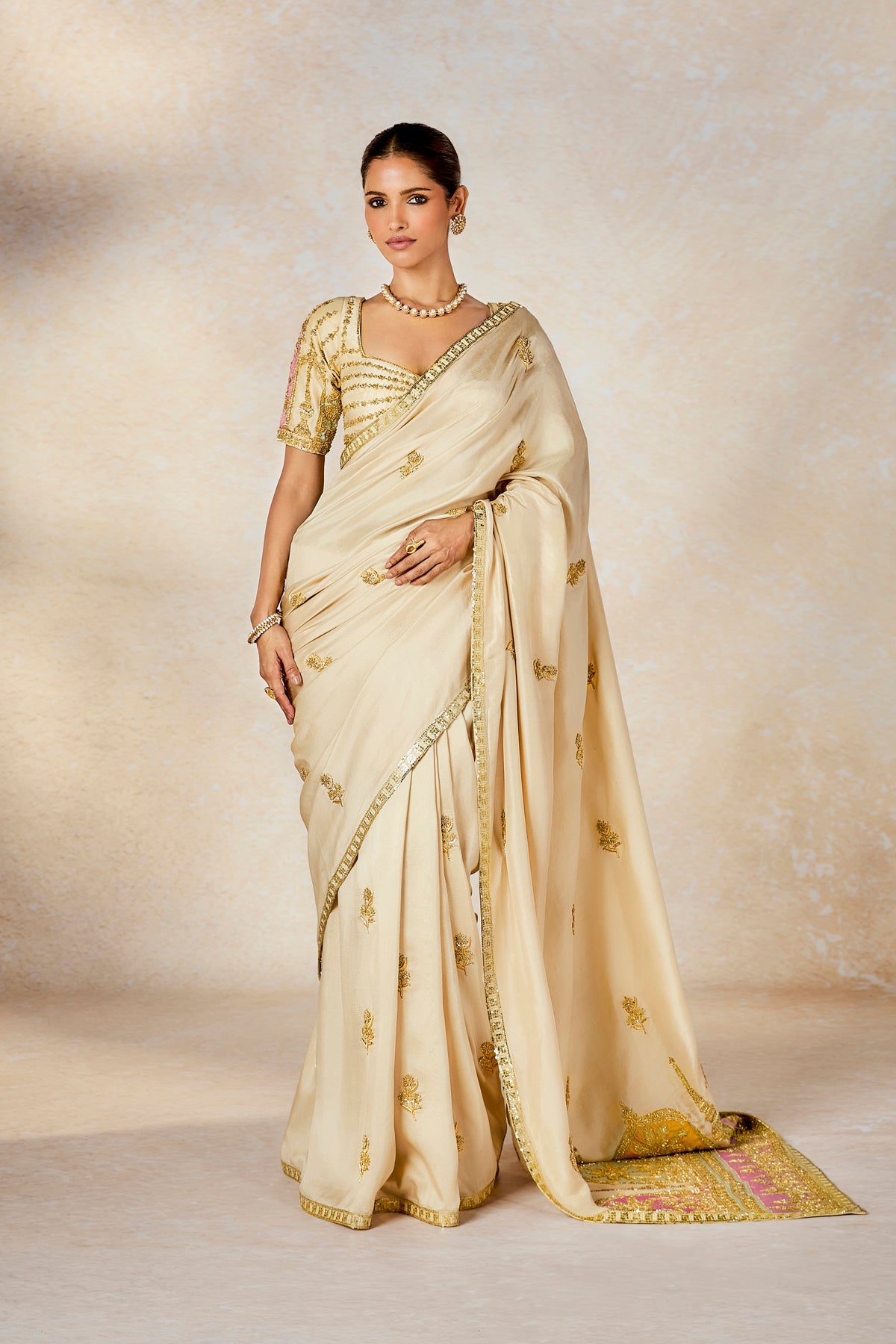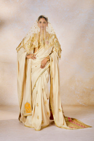 Description:In a dreamy hue, this angelic saree with patchwork 'Gul Jharokha' motifs on the pallu is a resplendent vision in itself. Embroidered in delicate gold for a vision in elegance, The Bombay Barfi saree is for a bride that is not afraid to be different at every occasion. Paired with a sweetheart neck blouse with, whimsical patchwork Jharokha on the sleeves, she is a vision in ivory. The veil is adorned with ananas motif in multicolor thread embroidery with cutwork detailing in hem. The stole is embellished with colour inserts in 'Gul Jharoka' motifs .