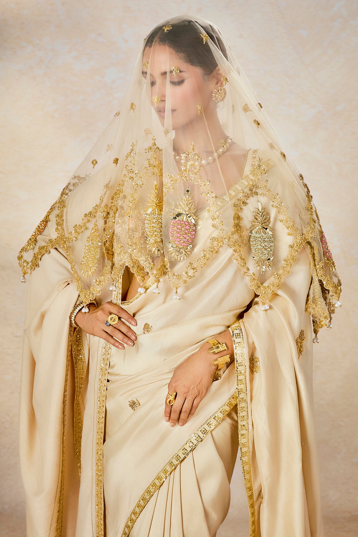 Fabric: Saree- Dupion | Blouse- Dupion | Stole- Silk | Veil- Tulle
