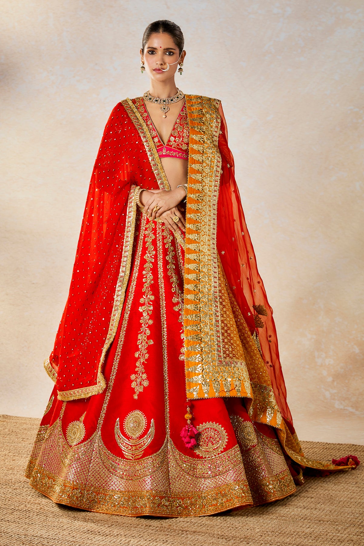 Fabric: Lehenga- Heavy Raw Silk | Blouse- Heavy Raw Silk | Dupatta 1- Silk Organza | Dupatta 2- Viscose Organza