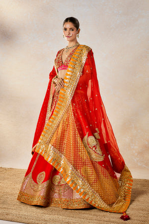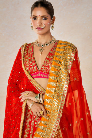 Description:The Gulab Sherbet lehenga pays homage to the traditional bride. The bride who isn't afraid to be bold and fearless. A classic in red, this lehenga is made in raw silk overlaid with a medley of our defining floral motifs and the Chand-phool motifs in gold. The unique patchwork dupatta with jaal work embroidered across the sunshine orange makes this lehenga perfect for a bride. Comes with a separate cancan.