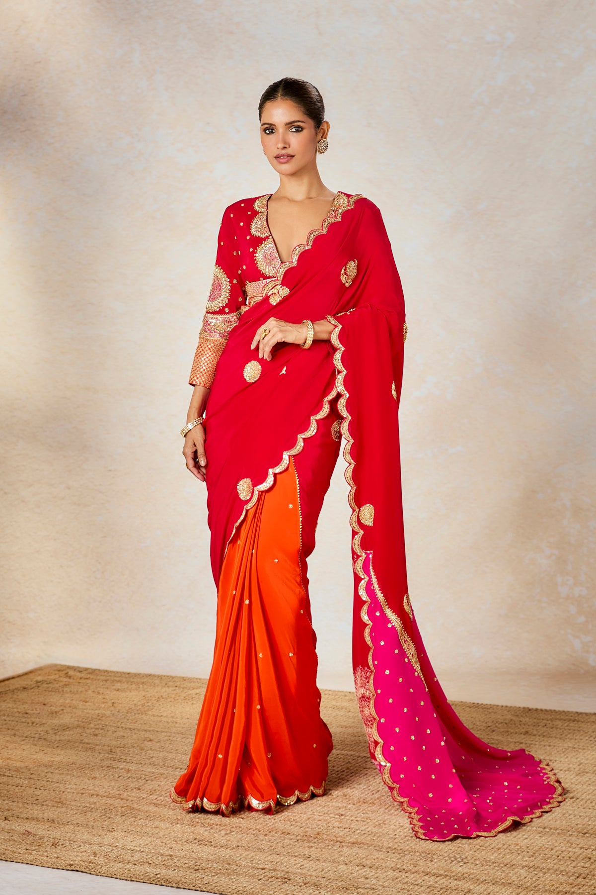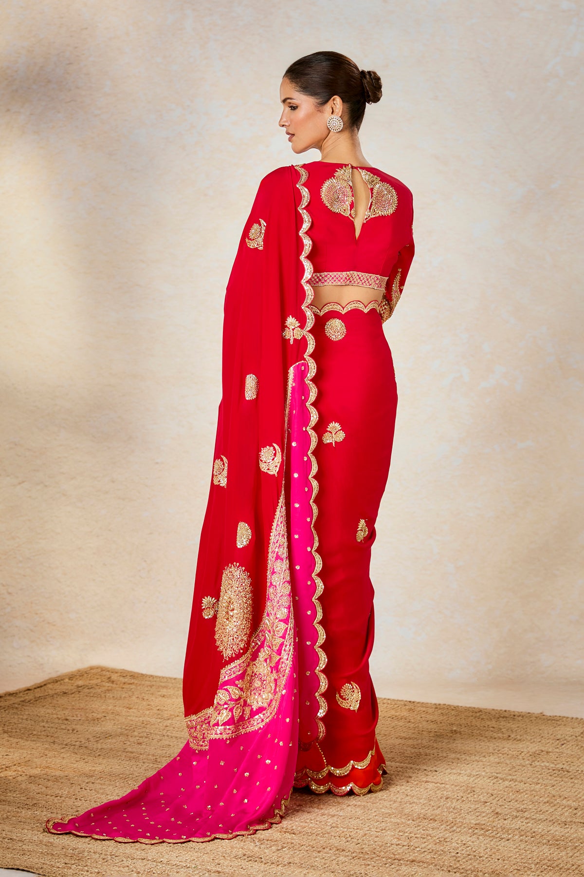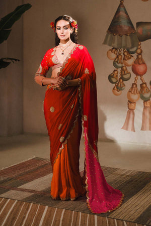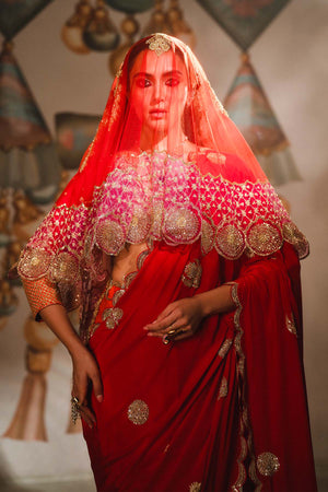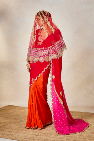 Description:Keeping tradition alive by blending a timeless hue with an eclectic aesthetic, consisting of a half and half colorblock of Reds, pinks and orange, The Gulab Sherbet saree is one of a kind. The Chand-phool motif taking center stage on the pallu with a scallop border in dainty gold. Paired with a similar patchwork blouse with jaal embroidery on the sleeve and and plunge V neck. The veil is adorned with bel motifs and jaal embroidery with red and pink patchwork.