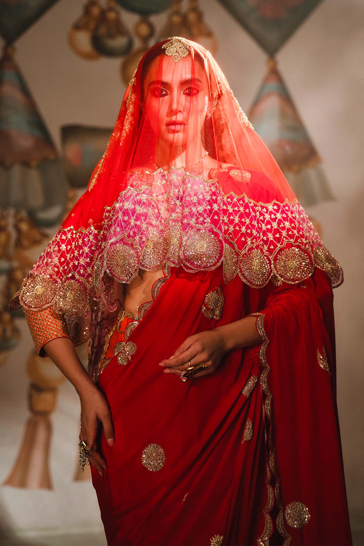 Fabric: Saree- Pure Crepe | Blouse- Pure Crepe | Veil- Tulle