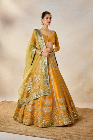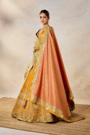 Details: Imarti Lehenga Set - Lehenga adorned with Raj Pankh motif in dori and sitara kaam | Hemline embellished with gota detail| Side zip closure | Pocket detail | Comes with a separate Can Can skirt. Blouse - Adorned with dori, sequins & gota kaam | Centre front closure | Tulle sleeve with delicate embroidered butis with gota detail Dupatta 1- Organza dupatta with embroidery all over in dori, sitara and moti kaam| Embellished with embroidered borders. Dupatta 2- Pure silk dhoop chao dupatta with intricate jaal embroidery all over in dori and sitara kaam | Embellished with embroidered borders.