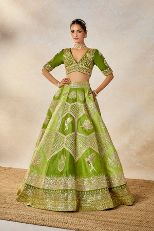 Description:Drawing inspiration from our house mascots that have been a part of our brand journey from the inception. With a beehive shaped jaal that runs across the 'Jaljeera' lehenga that delicately nestles iconic motif within it. It is paired with a deep V blouse embelished with zardozi and sitara work, the sleeves have a mixture of print and embroidery. A silk organza dupatta with dramatic florals embroidered in sitara embroidery is included. Comes with a separate cancan.
