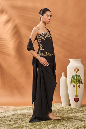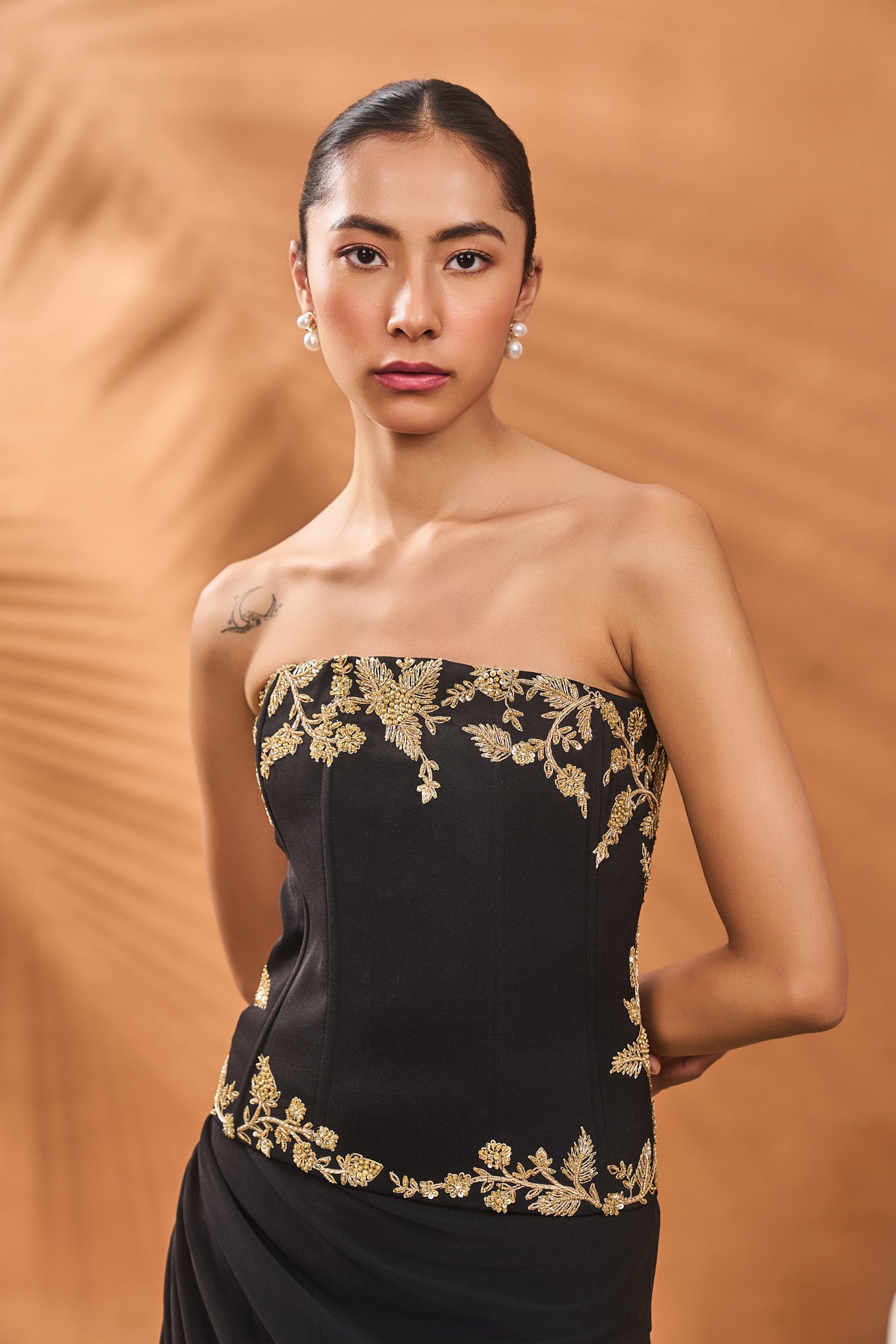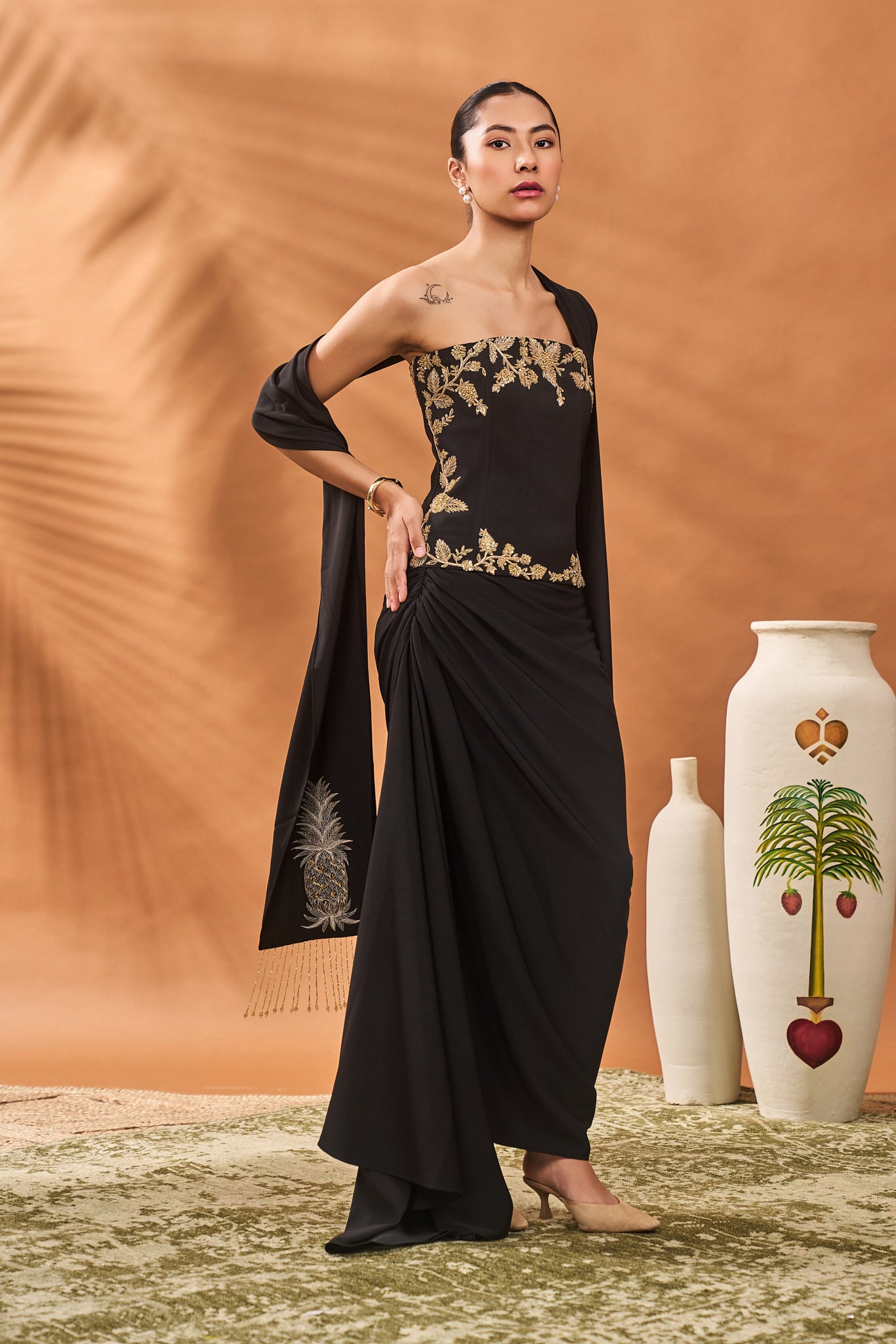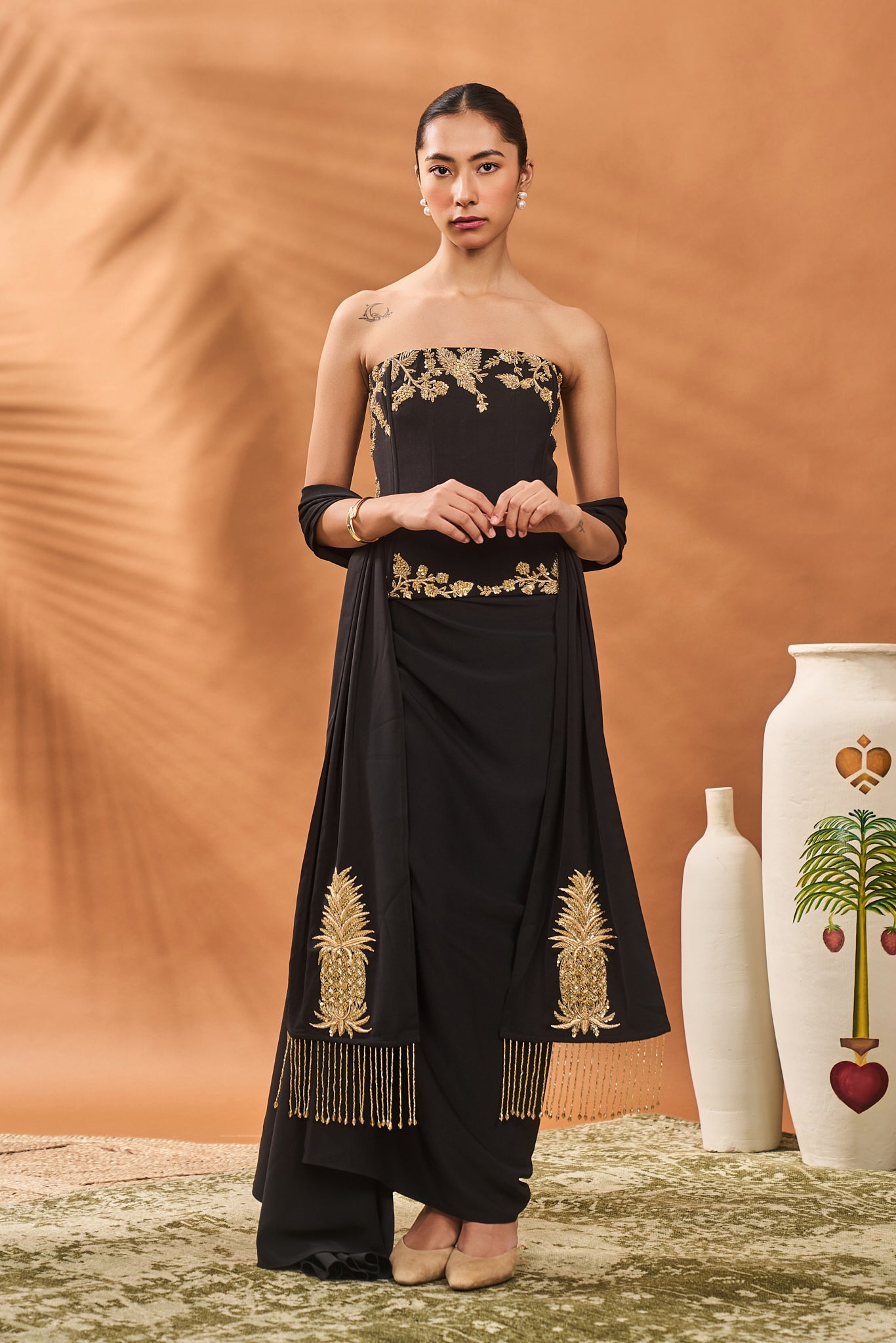 Description: Introducing The Kala-Khatta Corset Set, a captivating Indian fusion ensemble that blends traditional opulence with modern allure. This set features a structured corset, intricately adorned with gold embroidery inspired by the elegant 'Berry Bel' motif. The corset's design is elevated with exquisite gold work, crafted using zardozi, sequins, katdana and moti embroidery, creating a shimmering masterpiece that radiates sophistication. Paired with the corset is a draped skirt that adds a graceful flow to the ensemble, perfectly balancing the structured top. Completing the look is a delicate stole, adorned with two charming 'Anasam Phool' inspired motifs embroidered on the hemline, adding a playful yet refined touch. The Thandai Corset Set is ideal for festive occasions, weddings, or any event where you want to make a striking statement with a blend of tradition and contemporary style.