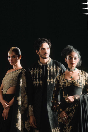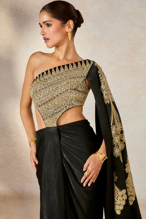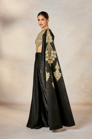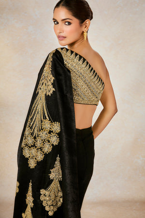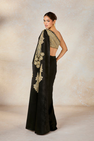 Description:The Kala Khatta Saree Gown defines tradition with a contemporary narrative. Inspired by the beautiful 'Kusum Kali' motif that showers down the pallu in bright gold sitara and moti embroidery. It has a one shoulder blouse that is elegant yet youthful and is completely embelished with our tricone border and a medley of motifs.