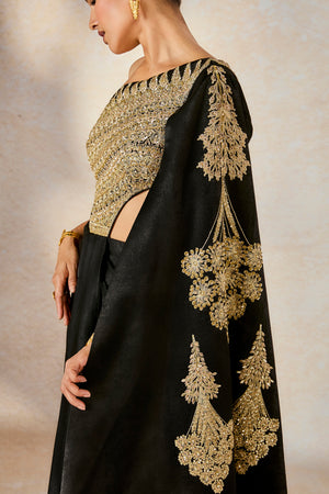 Details: Gown - One shoulder neckline | Side opening | Floor length | Embellished with bold motifs of 'Kusum Kali' on side drape | Attached side drape | Cut outs | Drape gown