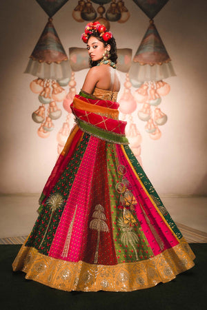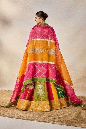 Description:Inspired by the age old craft of patchwork originating from the vibrant rural communities of Kutchch, The Rainbow Barfi lehenga is colorful, vibrant and exuding regality. 10 different prints, 5 different motifs come together to create artistry. Styled with a butterfly style corset blouse designed in tissue and embelished with Dori, dabka & moti kaam. Comes with a separate can can.