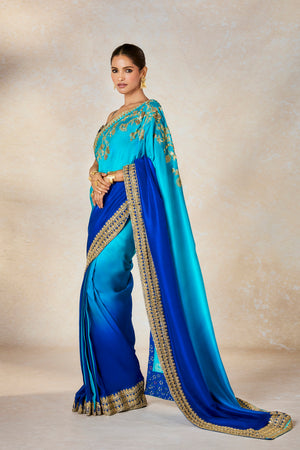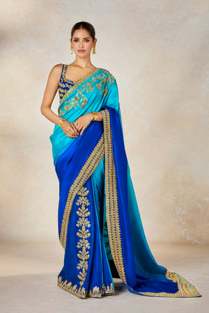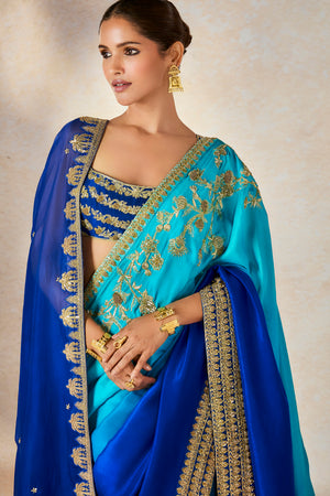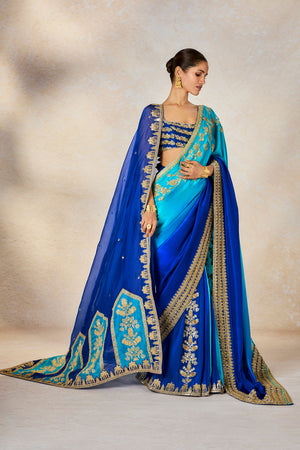Description:A Poetic drape in vivid blue, The Sanjh saree encapsulates the eccentric aesthetic of the brand in all its zany ways. This ornate ombre saree in hues of the sky has an intricate border on all sides accentuated with an anar jaal. With color block pleats and and a hero motif adding to its beauty, this saree is for the woman who finds her spot at every occassion. The dupatta has patchwork detailing with ornate embroidery.