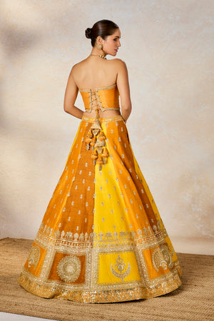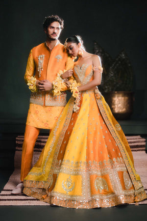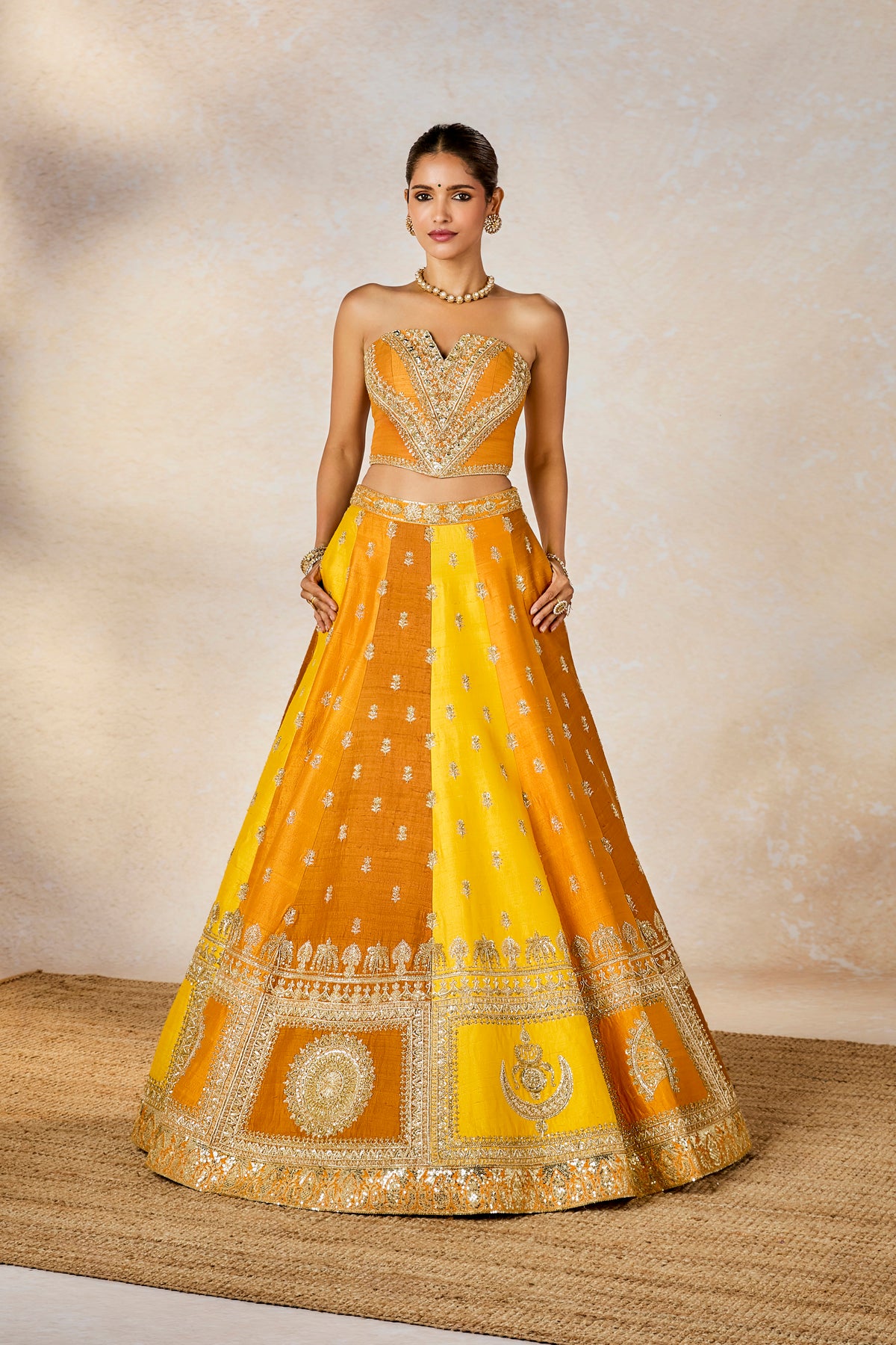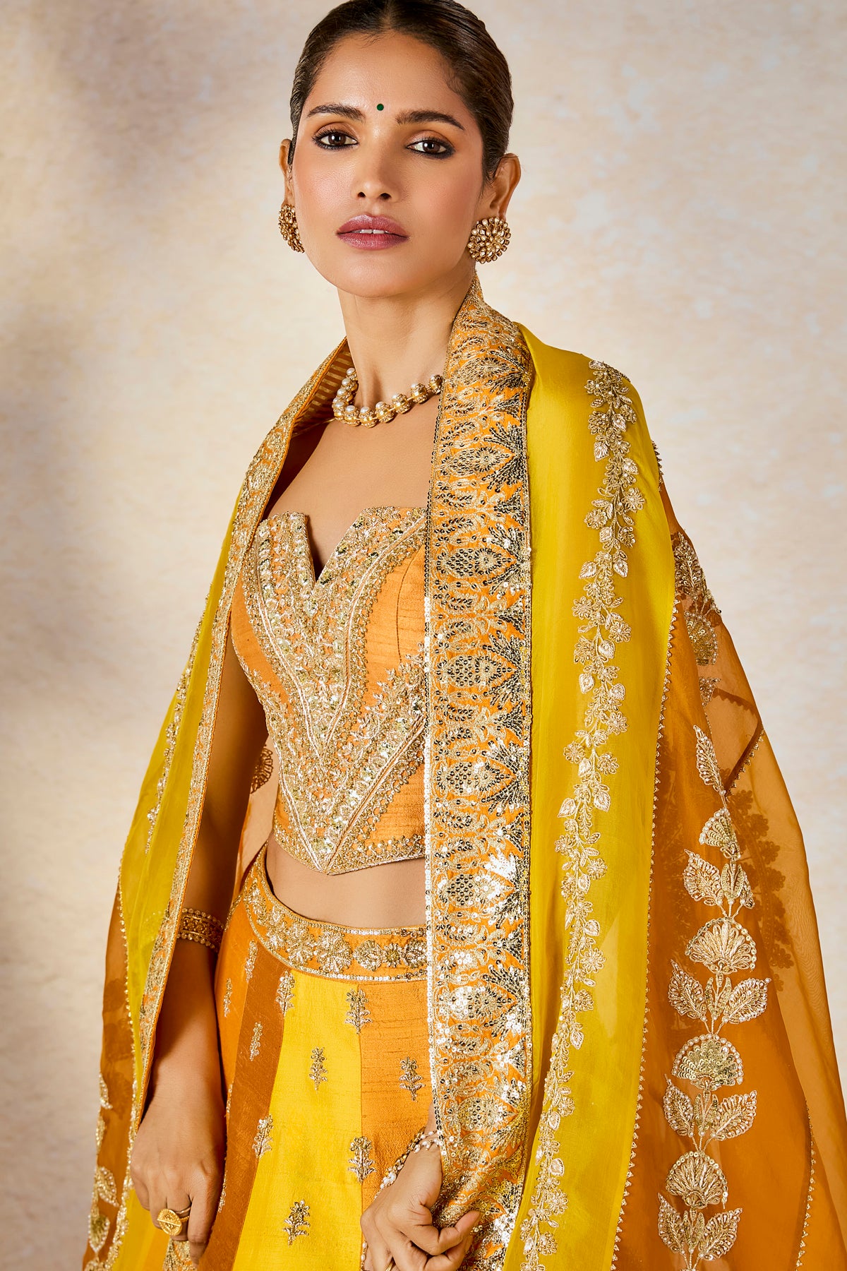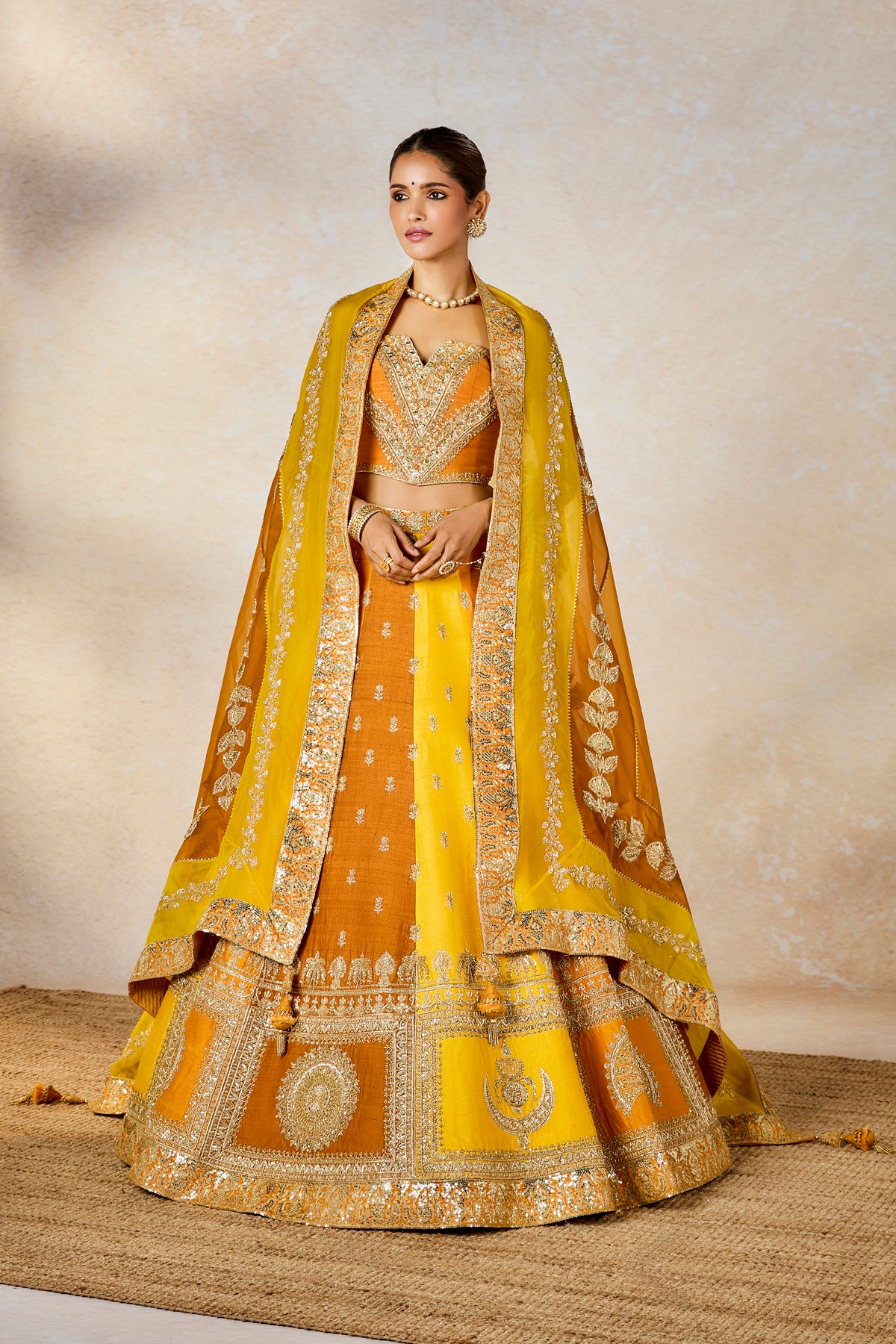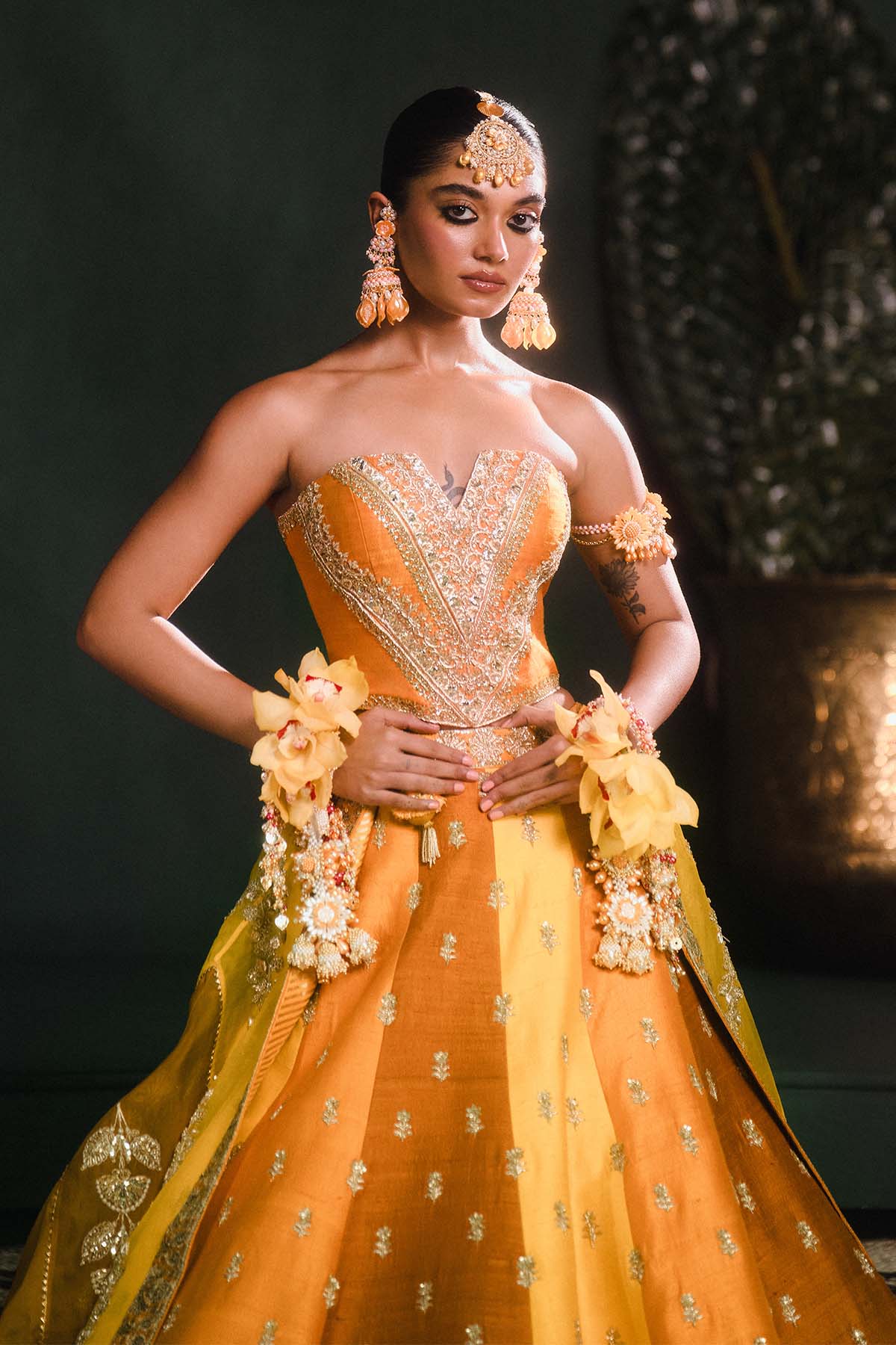 Description:Glittering like the hues of a sunrise, The Son Patissa lehenga is a perfect ensemble for the bride who is a burst of sunshine. A joyful resplendant silk lehenga with our Raj Pankh and Chand-phool motifs nestled within geometrical layout. The blouse unlike others, is a structured corset blouse heavily embroidered in intricate gold sitara embroidery. The dupatta is also patched with shades of ochre and hosts an enlarged Raj Pankh motif that brings the whole look together. Comes with a separate can can.