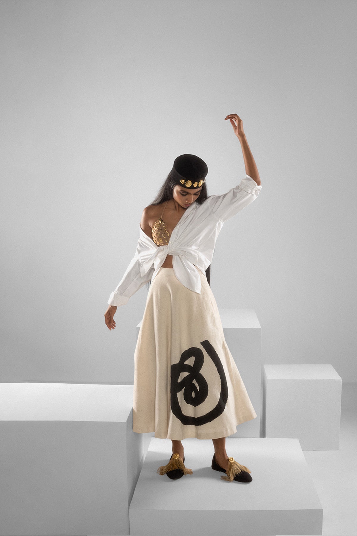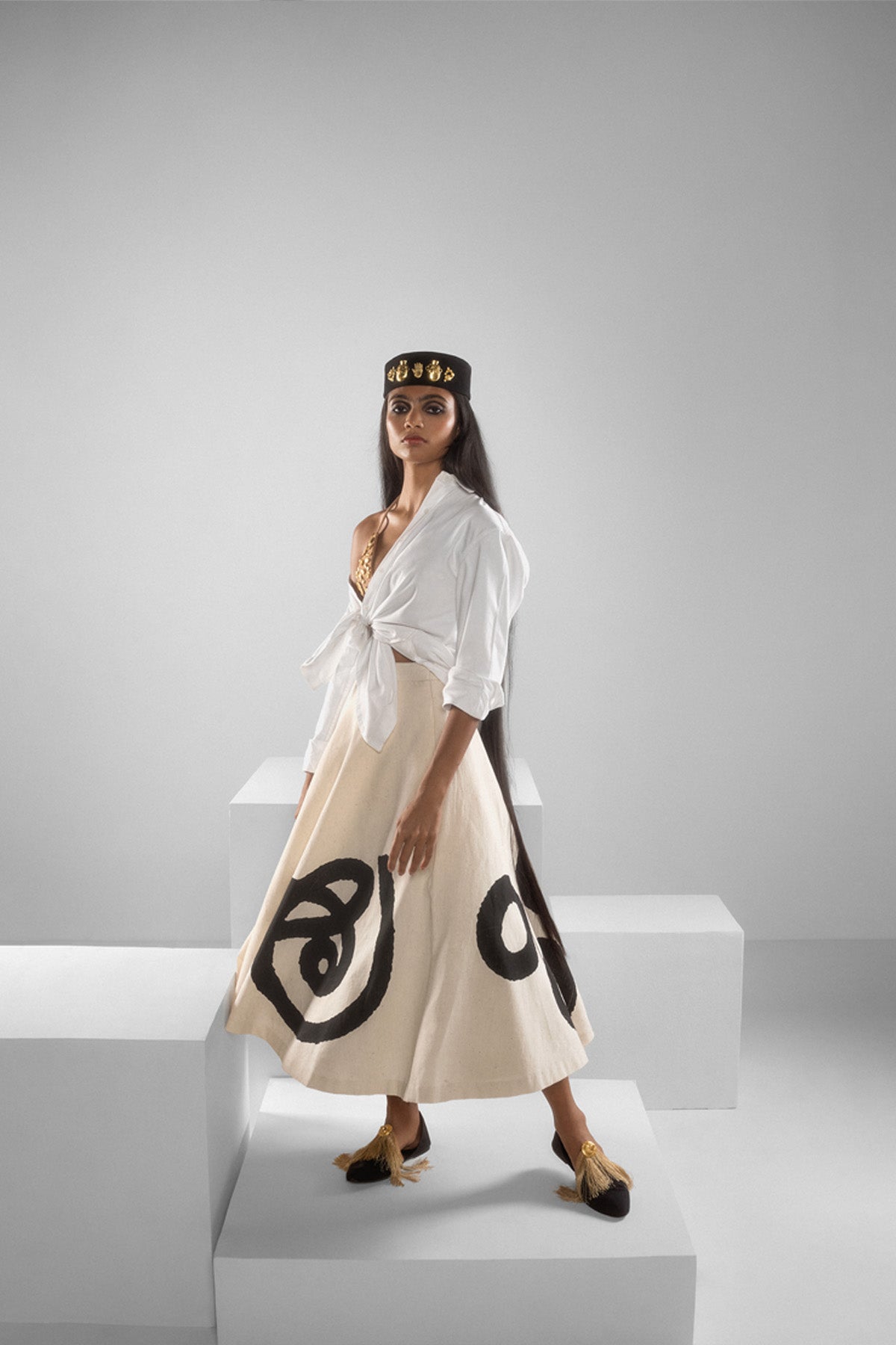 Skirt - Crafted in handwoven kora cotton with oversized tamil print high waisted swing skirt.