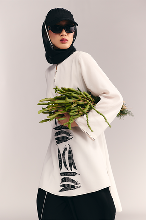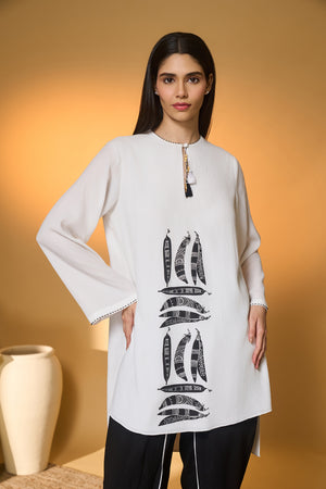 Details: Kurta- Split neckline with button closure adorned with tassels | Key-hole Detail | 'Totem Pod' khadi print placement | Bell Sleeves | Sleeve hem accented by contrast bead work | Dainty mascot charm on both the sleeves Pants- Tulip pants | Contrast piping detail