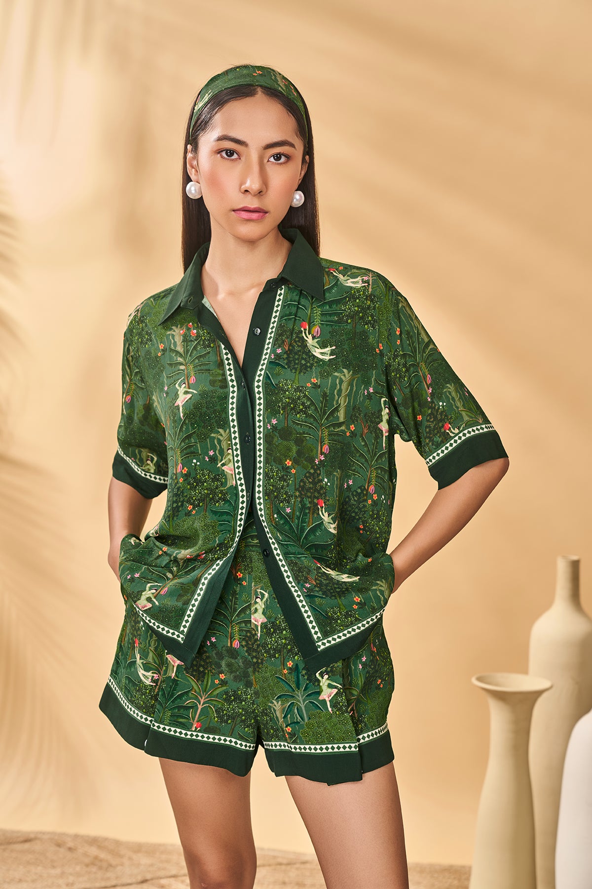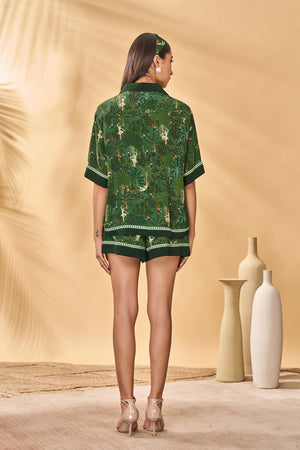 Details: Relaxed shirt | Printed border detail | Front button closure Shorts- Side zipper closure | Side pockets