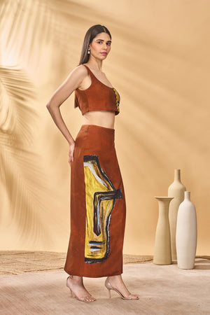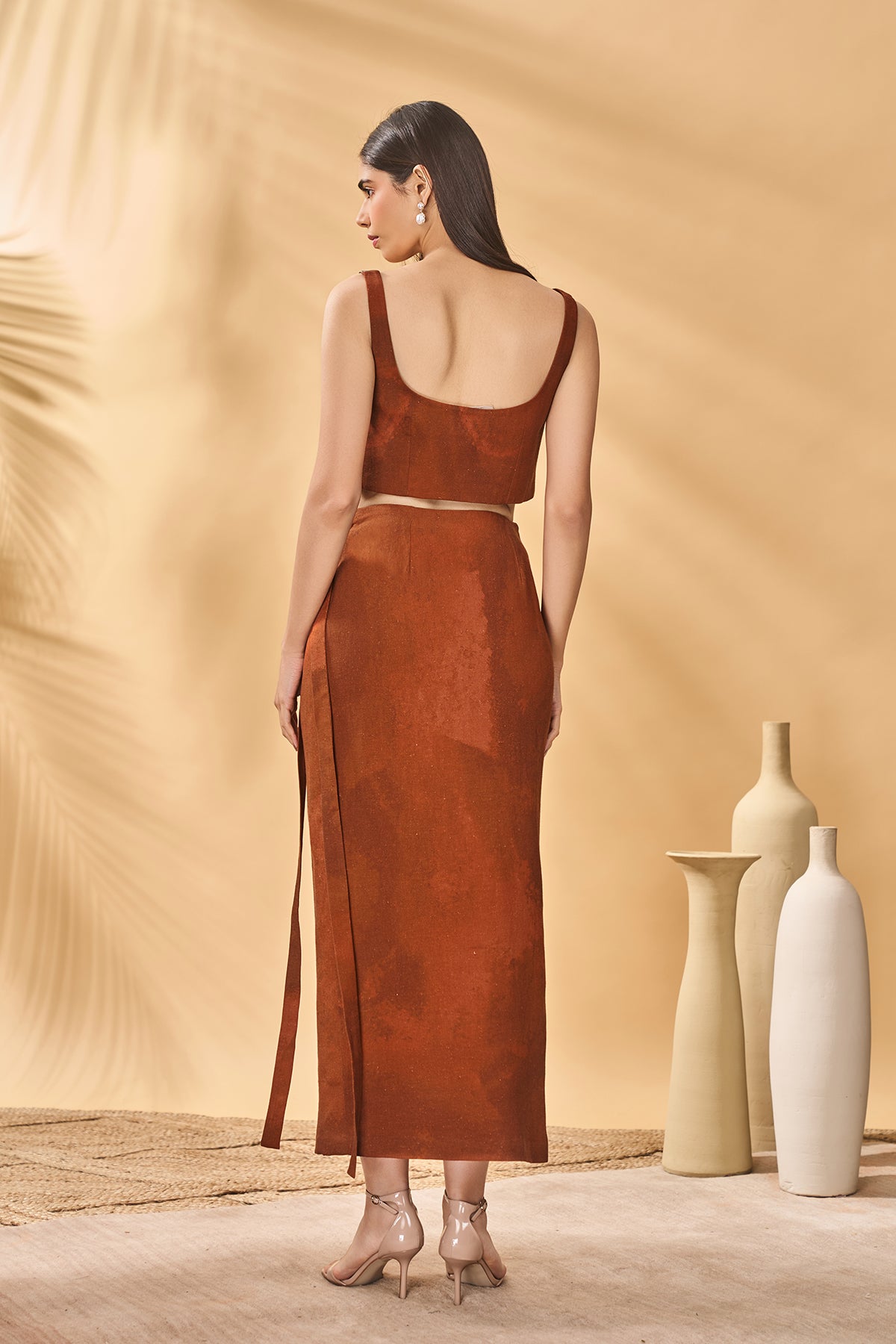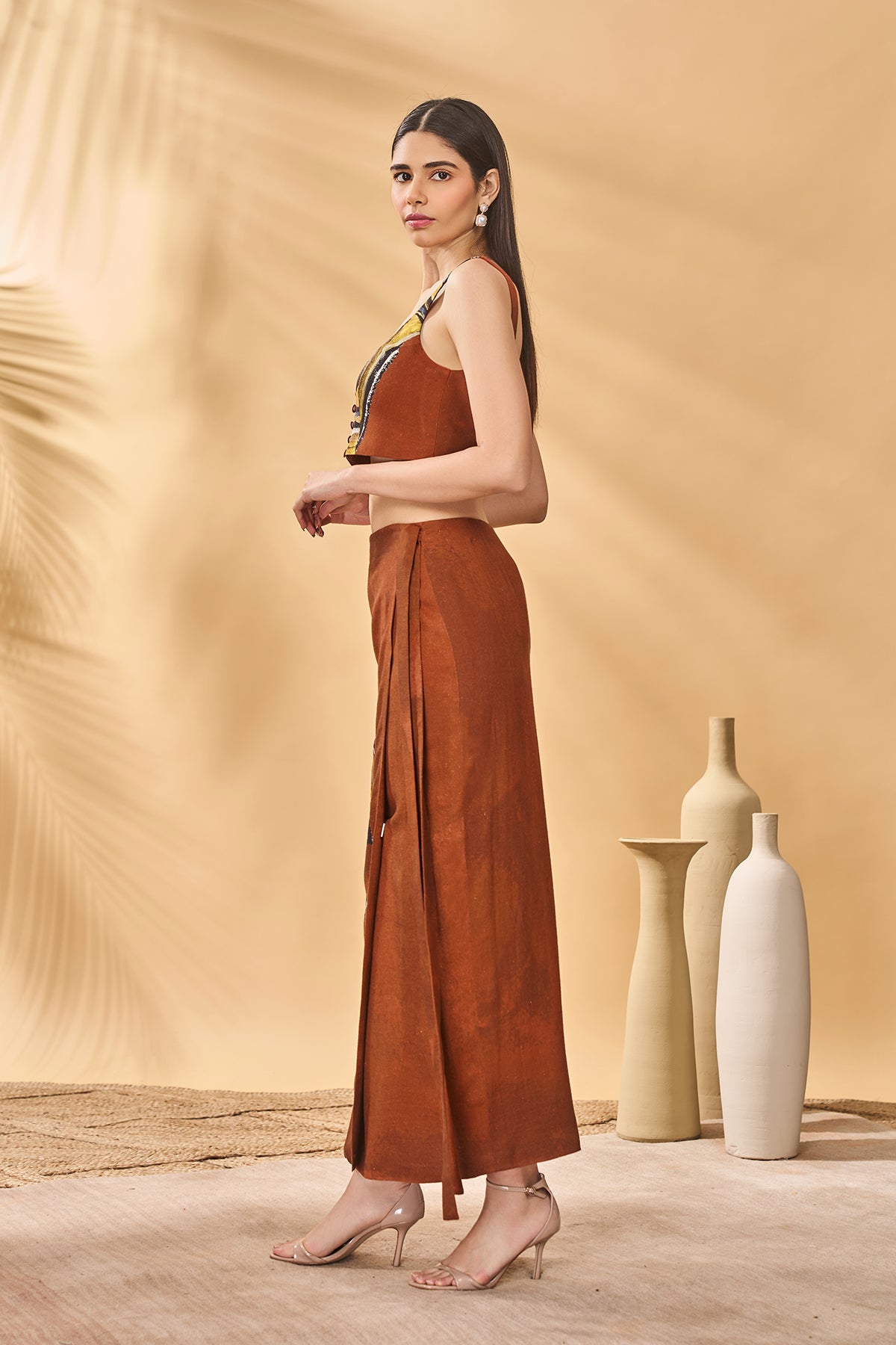 Details: Top- Scoop neck |semi fitted | two faced placement print Pareo- wrap skirt with tie up| two faced placement print