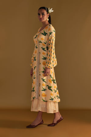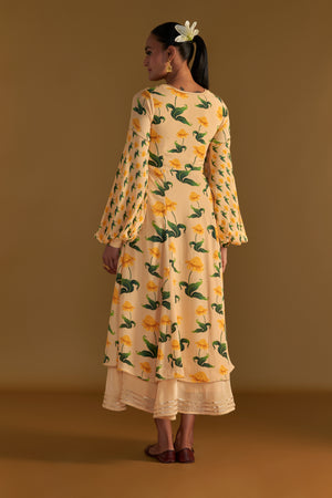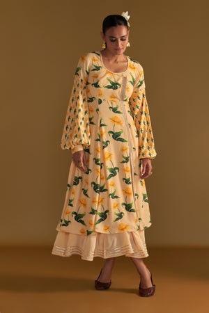 Details: Vanilla Poppy Petal Kurta Dress - Digital printed kurta dress | Layered hemline | Embellished with border and edged with kinari | Balloon sleeves