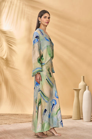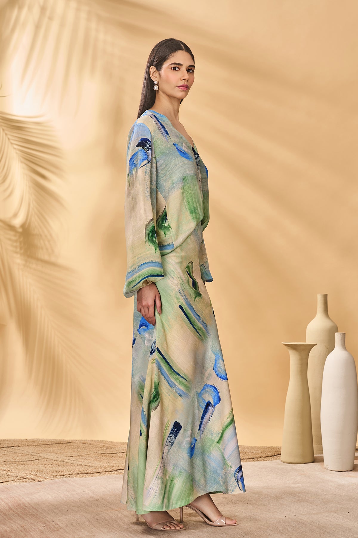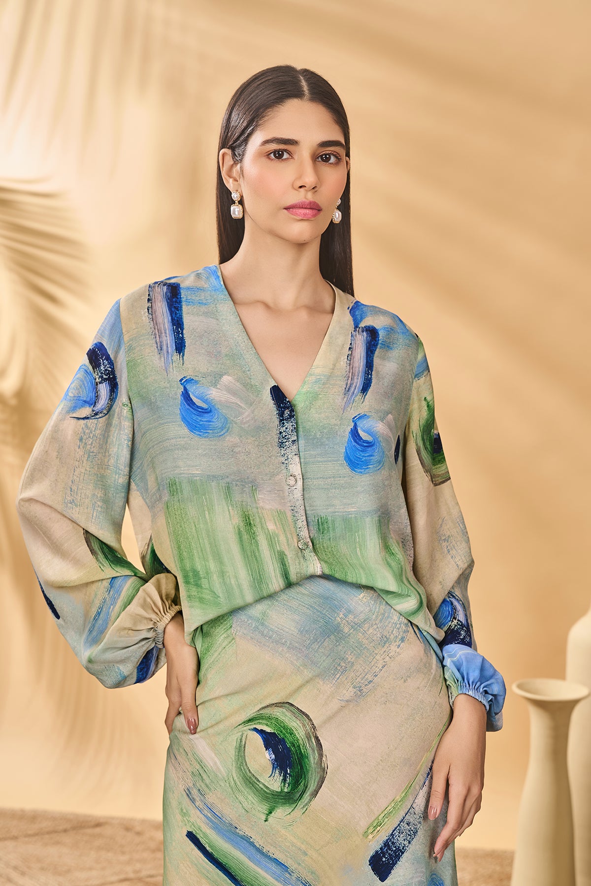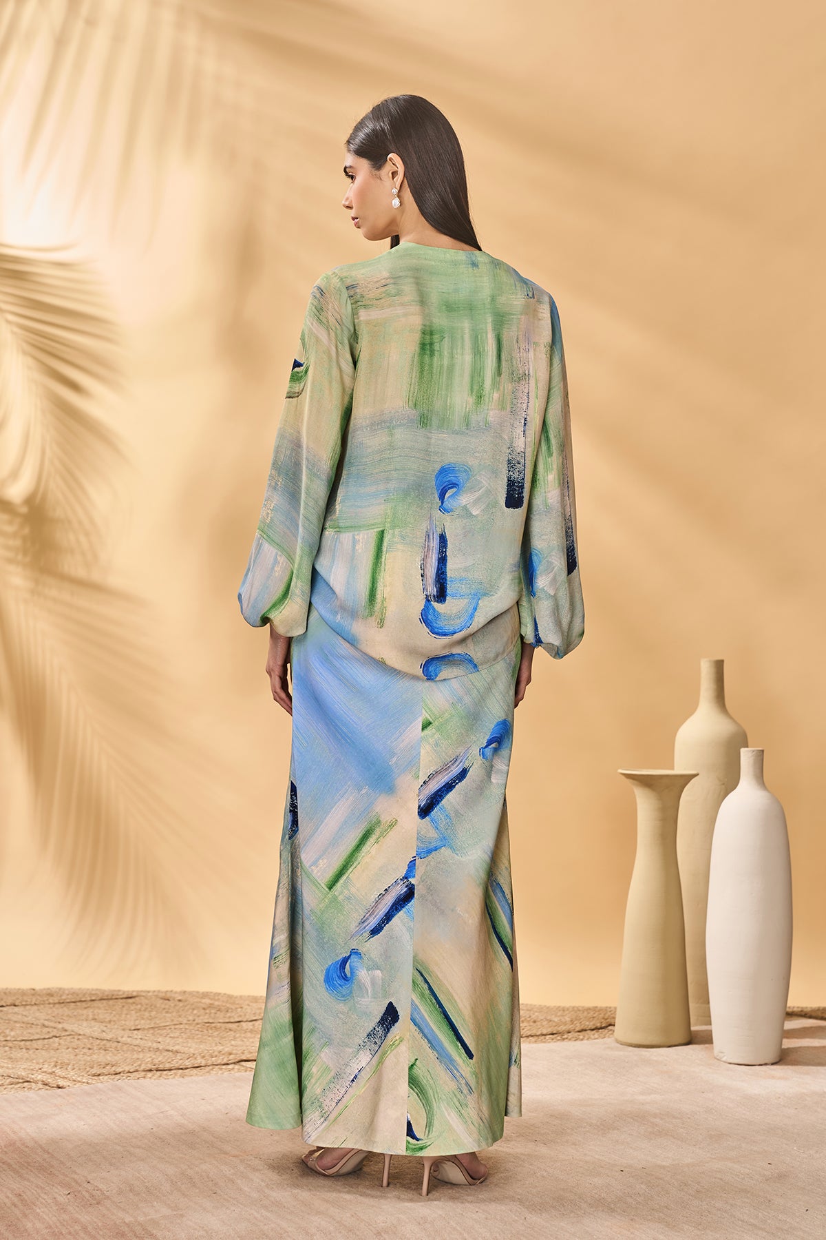 Details: Top- V-neck | Front button closure | Bellowy Sleeves Skirt- Trumpet skirt | Maxi length | Side zipper