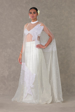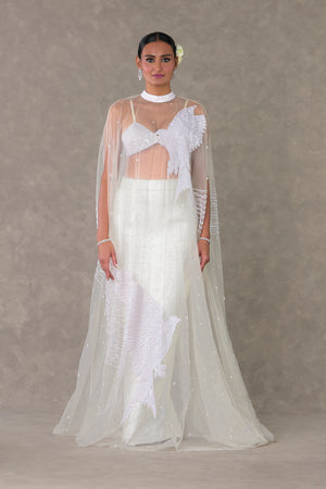 Details: White Son Chidiya Cape Set - Sitara skirt with a back slit | Centre back closure Bralette- Bralette embellished with sitara and moti kaam | Detachable fabric straps | Centre back closure Cape- Tulle cape embellished with oversized Son-Chidiya motif in sitara and moti kaam | Split sleeve | Collar with centre back closure