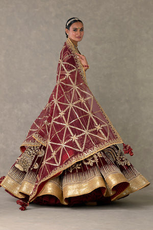 Styling: Pair this Wine color bridal lehenga with uncut polki, ruby gemstones and comfortable heels for added elegance. Style it with our beautiful organza dupatta draped elegantly over one shoulder for a timeless and classic look