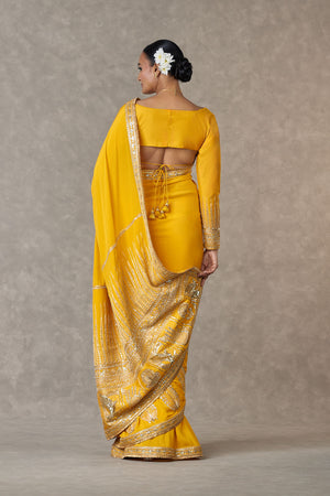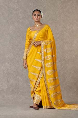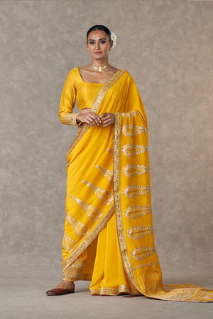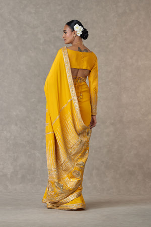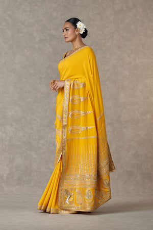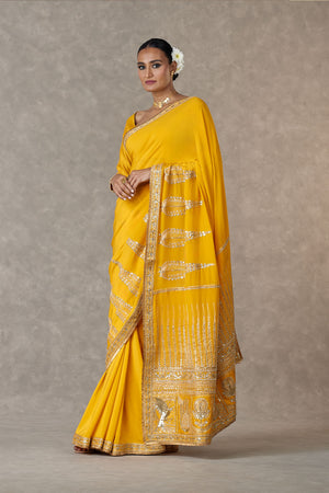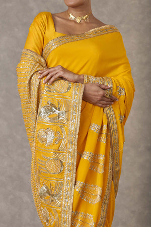 Details: Yellow Patti Saree - Palla intricately embroidered with signature motifs - Son-Patti, Son-Chidiya & Trikone in dori and sitara kaam | Embellished with embroidered borders | Printed backing