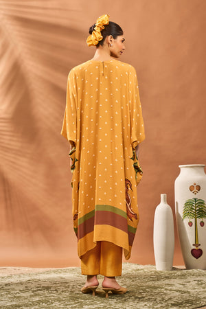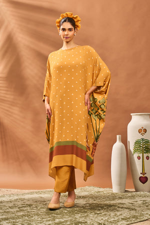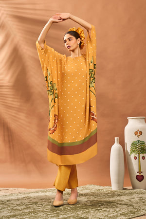 Details: Tunic- High and low all over printed tunic | A-line| Round neckine | Crochet Detail on the sleeves | Center back closure Pant- Yellow straight pants | Side seam closure